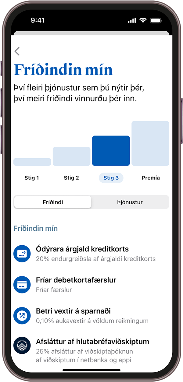 Hér getur þú skoðað mismunandi fríðindi eftir því á hvaða stigi þú ert, ásamt skilyrðunum sem þú þarft að uppfylla.