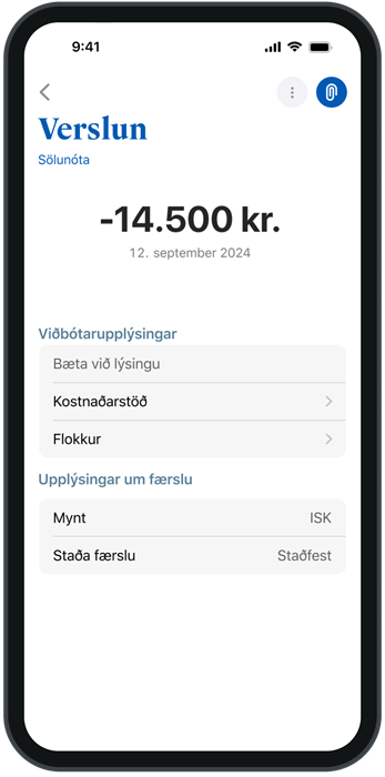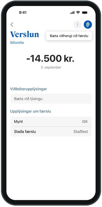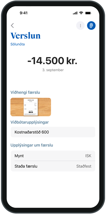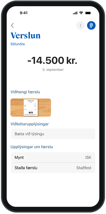 - Þær upplýsingar sem korthafi skráir verða samstundis aðgengilegar á hreyfingaryfirliti kreditkortsins í netbankanum. Færslur sem hafa viðhengi eða skýringu eru merktar með bréfaklemmu.