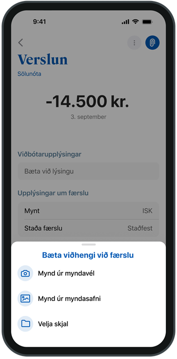- Á upplýsingaskjánum þarf að ýta á bréfaklemmuna, í hægra horninu, til þess að bæta viðhengi við færsluna.