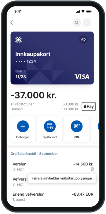 - Þegar verslað er með kreditkorti fyrirtækis fær korthafi senda tilkynningu frá Arion appinu.