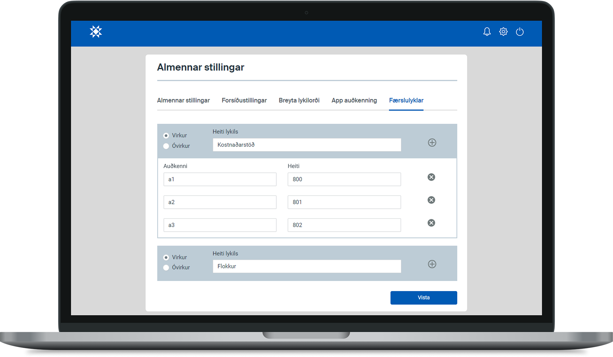 Þegar færslulykill hefur verið virkjaður er val um að forskrá valmöguleika fyrir korthafa undir hverjum færslulykli og er það gert með því að smella á plúsinn við hlið Heiti lykils og skrá Auðkenni og Heiti: