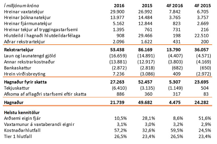 Eiginfjárhlutfall bankans var í árslok 27,1% en var 24,2% í árslok 2015. Hlutfall eiginfjárþáttar A hækkaði og nam 26,5% samanborið við 23,4% í árslok 2015.