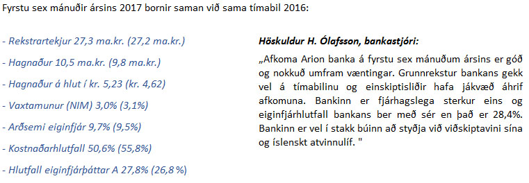 „Afkoma Arion banka á fyrstu sex mánuðum ársins er góð og nokkuð umfram væntingar. Grunnrekstur bankans gekk vel á tímabilinu og einskiptisliðir hafa jákvæð áhrif afkomuna. Bankinn er fjárhagslega sterkur eins og eiginfjárhlutfall bankans ber með sér en það er 28,4%. Bankinn er vel í stakk búinn að styðja við viðskiptavini sína og íslenskt atvinnulíf.