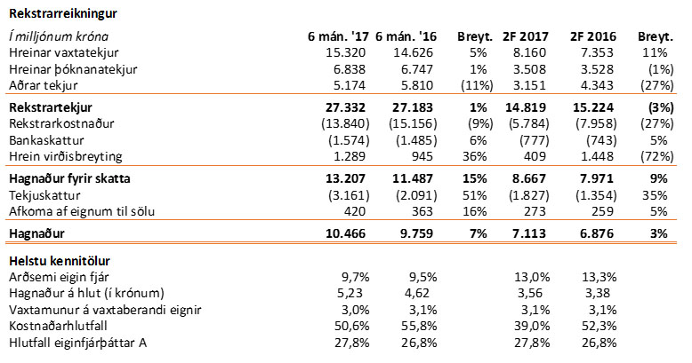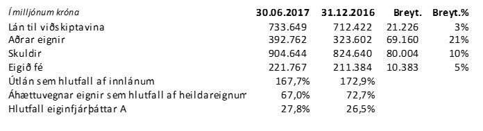 Eiginfjárhlutfall bankans var 28,4% í lok júní en var 27,1% í árslok 2016. Hlutfall eiginfjárþáttar A hækkaði og nam 27,8% samanborið við 26,5% í árslok 2016.