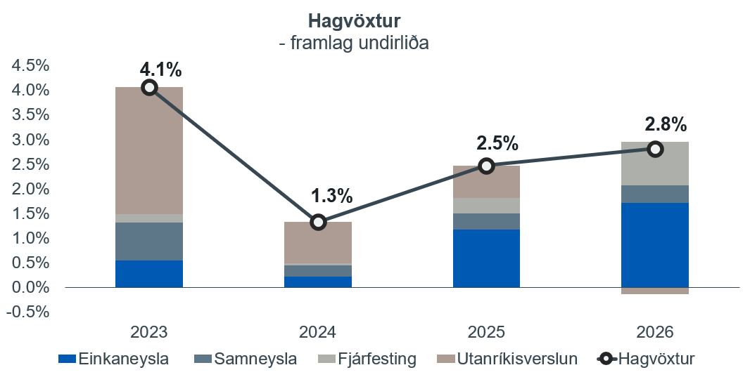 Greining Arion banka kynnti í morgun nýja efnahagsspá fyrir árin 2024-2026. Samkvæmt spánni verður 1,3% hagvöxtur í ár, sem er nokkuð minni vöxtur en áður var gert ráð fyrir. Breytinguna má fyrst og fremst rekja til einkaneyslunnar, sem hefur gefið meira eftir en áður var spáð. Þróun innlendrar eftirspurnar á yfirstandandi ári dregur dám af stórfelldum vaxtahækkunum síðasta árs, þar sem útlit er fyrir óverulegan einkaneysluvöxt og óbreytta fjárfestingu. Á móti vega ágætar útflutningshorfur, einkum í ferðaþjónustu, en ekki síður í öðrum „óhefðbundnari“ útflutningsgreinum, s.s. eldi. Því er útlit fyrir að utanríkisverslun sitji sem fastast í bílstjórasætinu og drífi áfram hagvöxtinn, annað árið í röð.