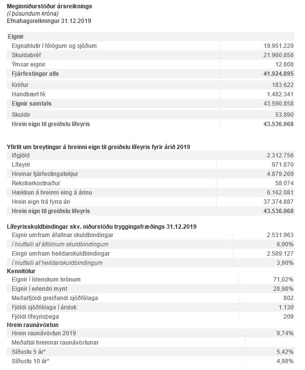 Á heildina litið var árið 2019 afar gott ár í rekstri sjóðsins. Raunávöxtun á eignum lífeyrissjóðsins var 9,7% árið 2019 og meðaltal hreinnar raunávöxtunar sl fimm ár er nú 5,4%. Tryggingafræðileg úttekt var gerð á stöðu sjóðsins miðað við árslok 2019, samkvæmt útreikningum tryggingastærðfræðings er tryggingafræðileg staða sjóðsins í lok árs jákvæð um 3,9% samanborið við 1,8% árið 2018.
