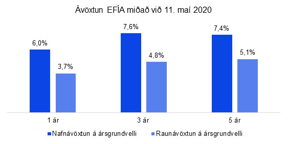 Samhliða þeim jákvæðu breytingum sem urðu í apríl mánuði hefur ávöxtun EFÍA heldur hækkað frá þeim tölum sem birtar voru í lok marsmánaðar og má sjá á mynd hér að neðan að 12 mánaða ávöxtun er nú 6,0% sem svarar til 3,7% raunávöxtunar. Við höfum ekki enn séð fyrir endann á áhrifum Covid 19 á heimshagkerfi og markaði en það er þó ánægjulegt að geta upplýst um jákvæða stöðu sjóðsins í því umróti sem við förum nú í gegn um.